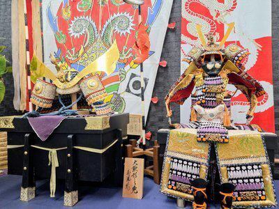 50年以上前から大切に保存してきた武者人形と兜。今年の端午の節句にあたり、ご宿泊になるお子様、皆様のご健勝を祈念しフロントへ飾っております。